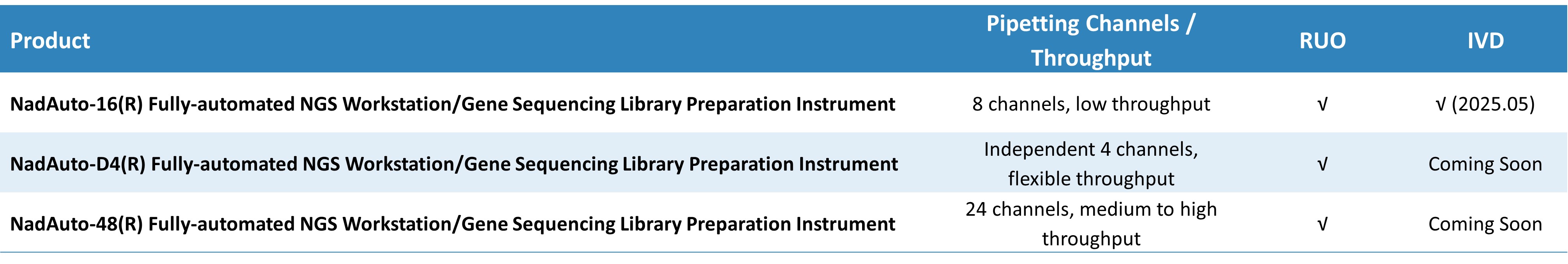NadAuto‑D4(R) Fully-automated NGS Workstation, independently designed and developed by Nanodigmbio, is a flexible‑throughput automation platform engineered to maximize laboratory efficiency. It supports the full NGS workflow, including sample aliquoting, nucleic acid extraction, DNA normalization, purification, quantification, sample pooling, library preparation, and hybrid capture. NadAuto‑D4(R) features four independent pipetting channels, seamlessly integrated with an optional thermal cycler, temperature control module, heating and oscillating module, purification module, fluorometer, UV lamp, and HEPA filter. With 20 SBS‑standard deck positions, it flexibly accommodates 1–16 pre-libraries preparation and 1–8 hybrid capture reactions to meet diverse throughput requirements.