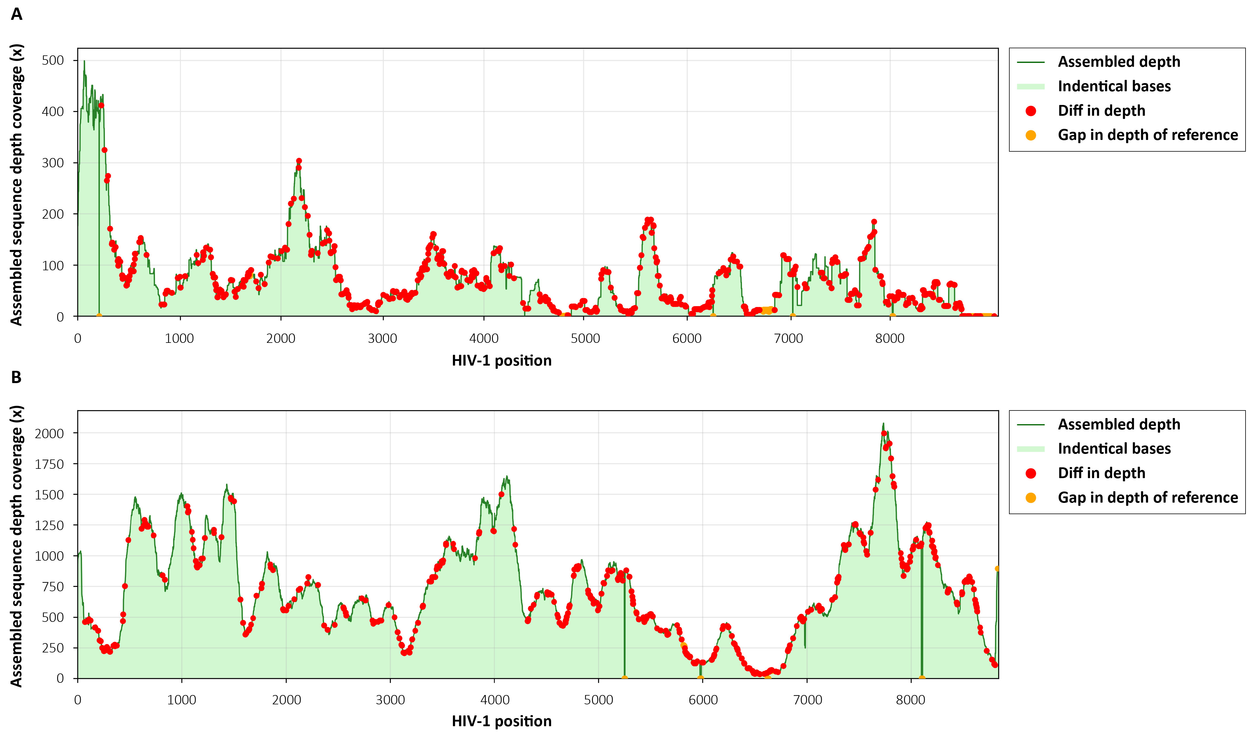 To evaluate the performance of the μCaler HIV-1 Whole-Genome Complete Testing Solution in HIV-1 whole genome sequencing and assembly, we analyzed the sequence identity between assembled full-length genome sequences and the reference sequence, and whole-genome coverage depth.