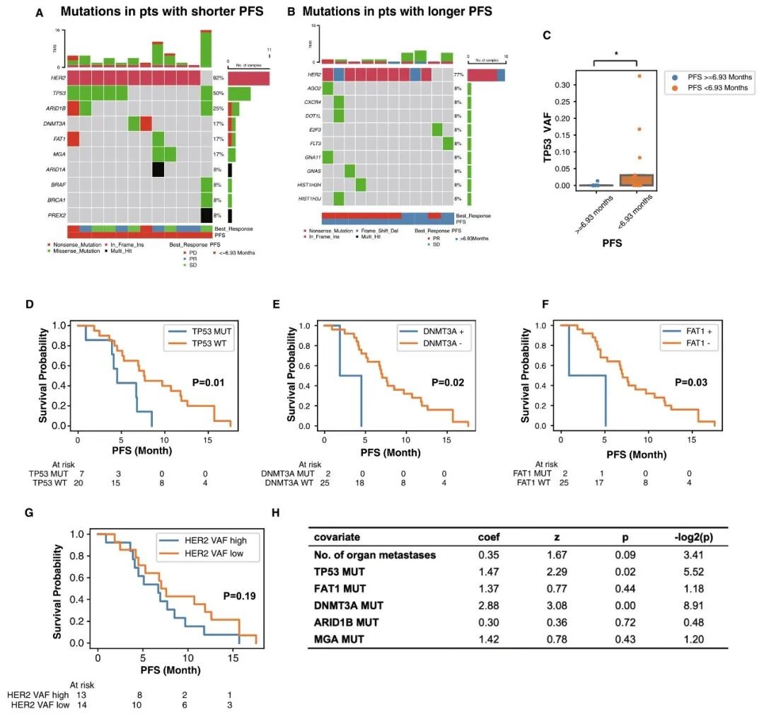 A & B. 按 PFS 长度分组的 ctDNA 突变图谱 (A. PFS 短于 6.93 个月的患者;B. PFS 长于 6.93 个月的患者);C. 长 PFS 组和短 PFS 组之间 TP53 突变 VAF 的差异;D-F.TP53 (D)、DNMT3A (E)、FAT1 (F) 共突变状态分组的患者 PFS 的 Kaplan-Meier 估计;G.HER2 VAF 丰度分组的患者 PFS 的 Kaplan-Meier 估计;H. Cox 多变量回归分析评估临床和 ctDNA 基因组特征与患者 PFS 的相关性。单变量 Cox 分析中 P < 0.1 的变量被纳入模型。