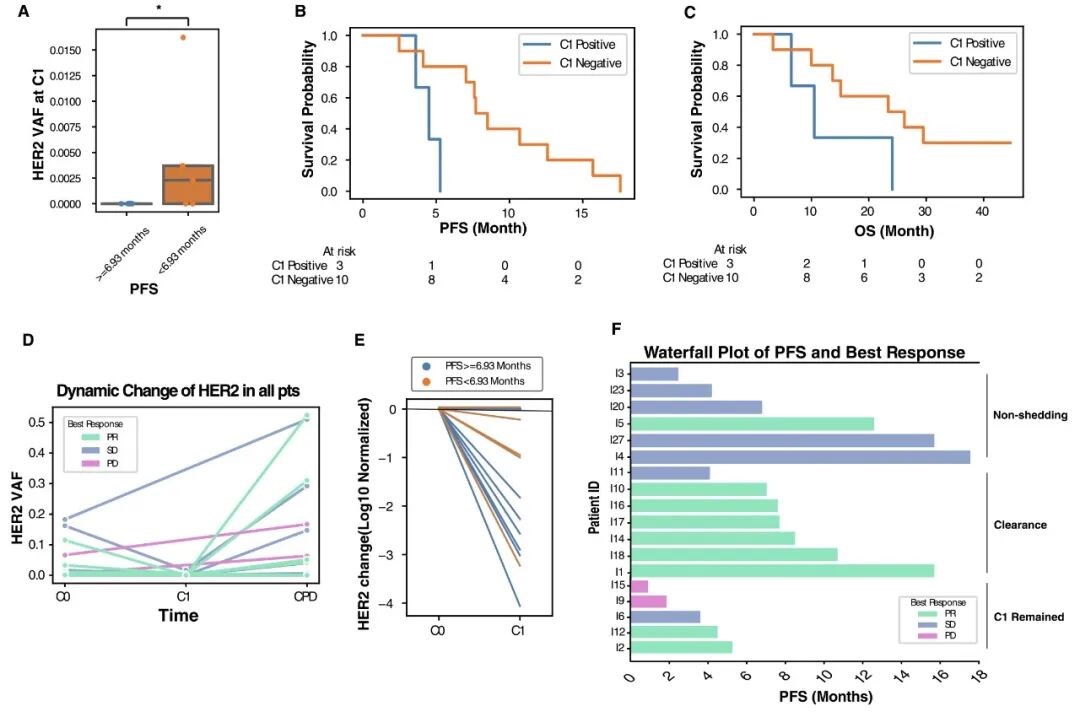 A. 长 PFS 组和短 PFS 组 HER2 突变 VAF 的差异;B & C. 按 C1 时 HER2 突变状态分层的患者 PFS (B) 和 OS (C) 的 Kaplan-Meier 估计;D. 治疗期间 HER2 突变频率的动态变化;E. 基线与一个治疗周期后 HER2 突变频率差异的比较;F. ctDNA 非脱落、清除和持续存在患者的最佳总体疗效和 PFS。