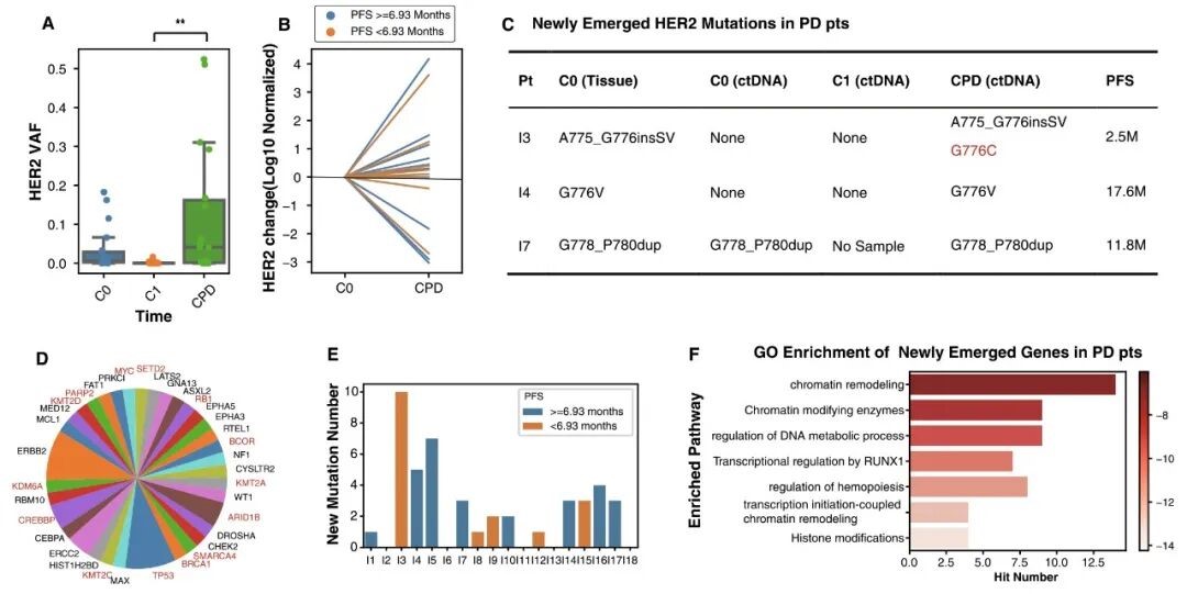 A. 不同时间段 HER2 突变 VAF 的差异;B. 一个治疗周期后与疾病进展后 HER2 突变频率差异比较;C. 疾病进展患者中新出现的 HER2 突变;D. 疾病进展后患者新出现的共突变;E. 患者新突变的数量;F. 疾病进展后新突变的基因本体论富集分析。