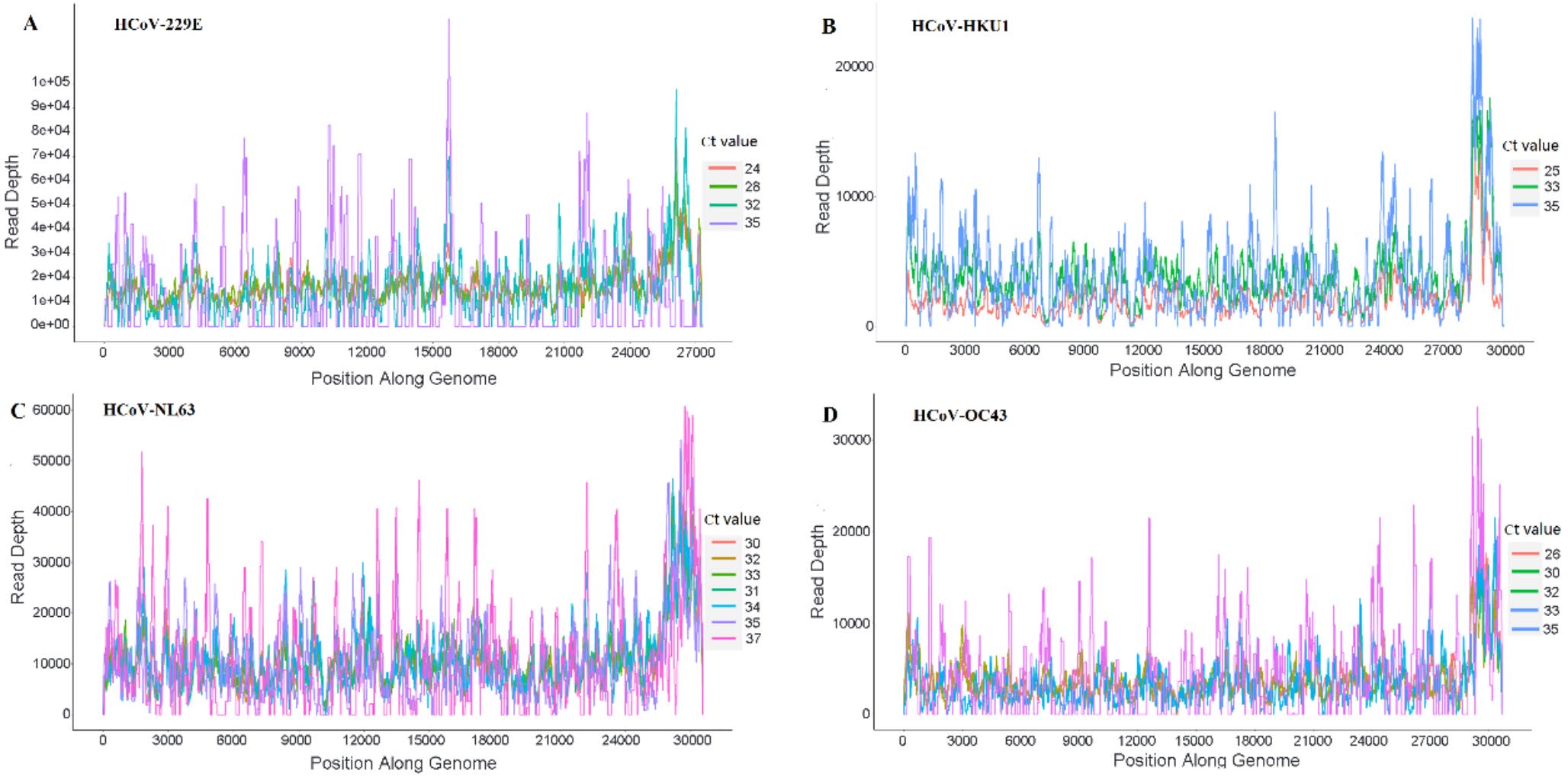 该研究通过参考品梯度稀释实验系统评估了 MT-Capture 技术的灵敏度。结果显示,该技术在 Ct ≤ 32 的样本中可实现 100% 全基因组覆盖,在更高 Ct 值 (低病毒载量) 样本中仍表现优异:Ct=35 的 HCoV-HKU1 覆盖率达 94.73%,Ct=37 的 HCoV-NL63 覆盖率仍达 85.25%,且所有样本测序深度均匀 (图 1.),充分验证该方法对低病毒载量临床样本的检测能力远超传统方法。