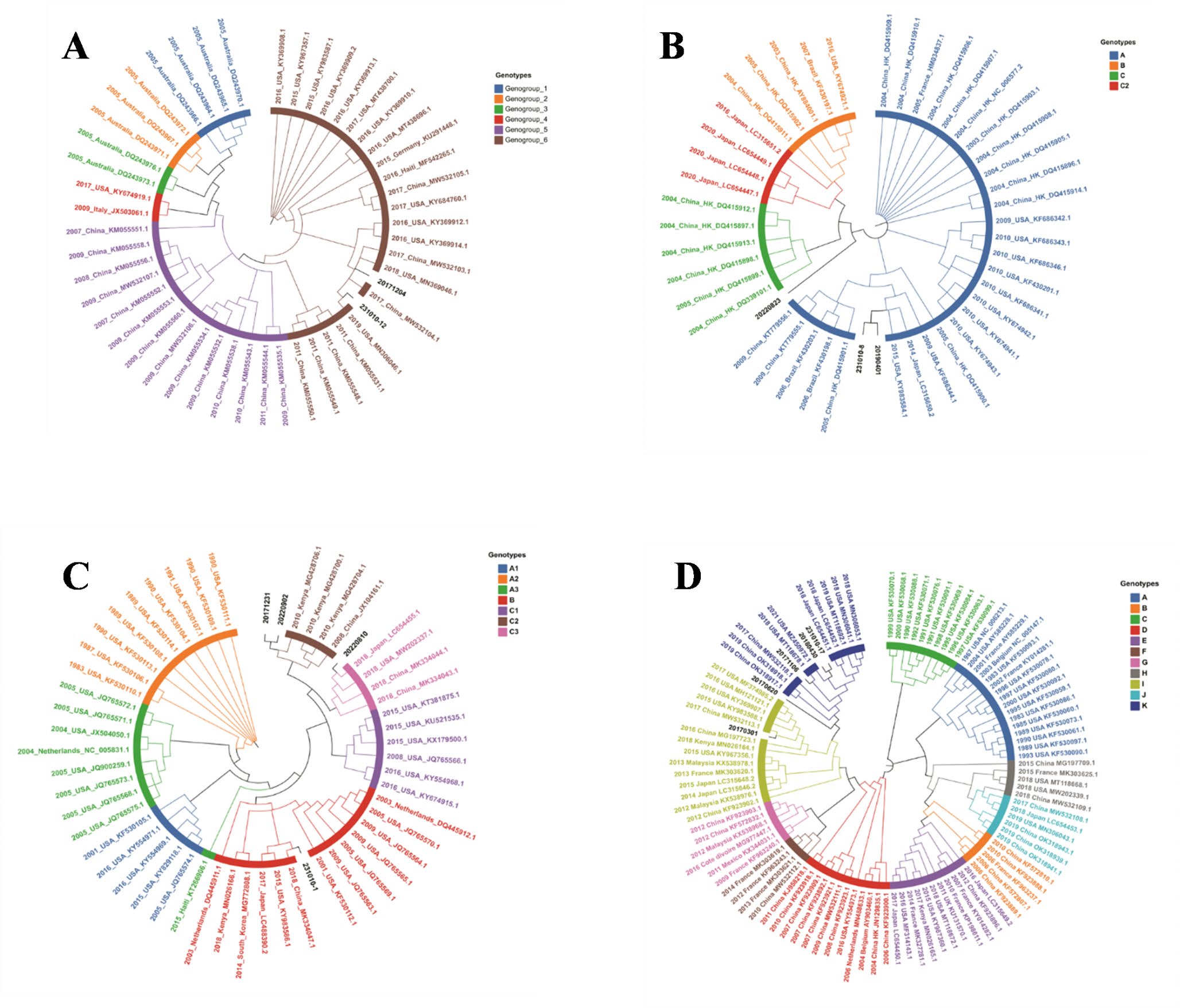 2017-2023 年,江苏省疾控中心及省内医院收治的 14 例呼吸道感染患者咽拭子,经 qPCR 鉴定分型:HCoV-229E (2 例)、HCoV-HKU1 (3 例)、HCoV-NL63 (4 例)、HCoV-OC43 (5 例),Ct 值 23-36。