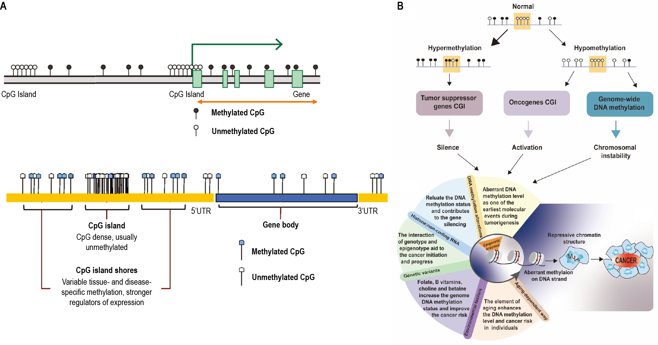 图 1. DNA 甲基化概览。A. 典型的哺乳动物中 DNA 甲基化模式图谱[1]B. 癌症发生中的 DNA 甲基化异常概述[2]