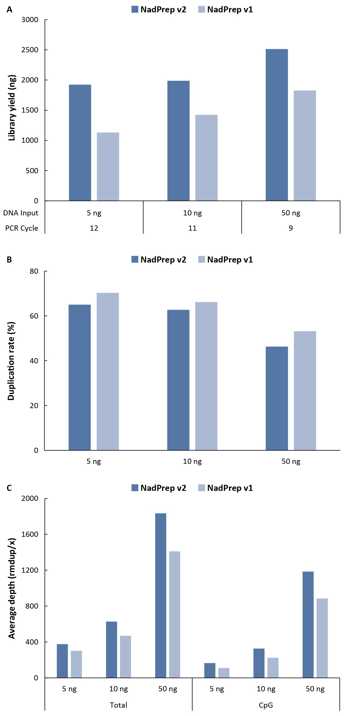 图 3. NadPrep® Methyl Stubby Adapter (UDI) Module v2 及 v1 对不同起始量 gDNA 样本的建库性能。A. 文库产量;B. 重复率;C. 去重后平均覆盖深度。不同起始量 gDNA 样本利用 NadPrep® Methyl Library Preparation Module v2 分别搭配 NadPrep v2 及 NadPrep v1 接头模块经 BS 转化后构建预文库,以 μCaler® Hybrid Capture Reagents v2 和 μCaler® EMS Panel v1.0 (约 20 Kb,2,097 个 CpG 位点) 完成杂交捕获。测序模式为 NovaSeq 6000,PE150,随机选取 1 M reads pair 进行数据分析。