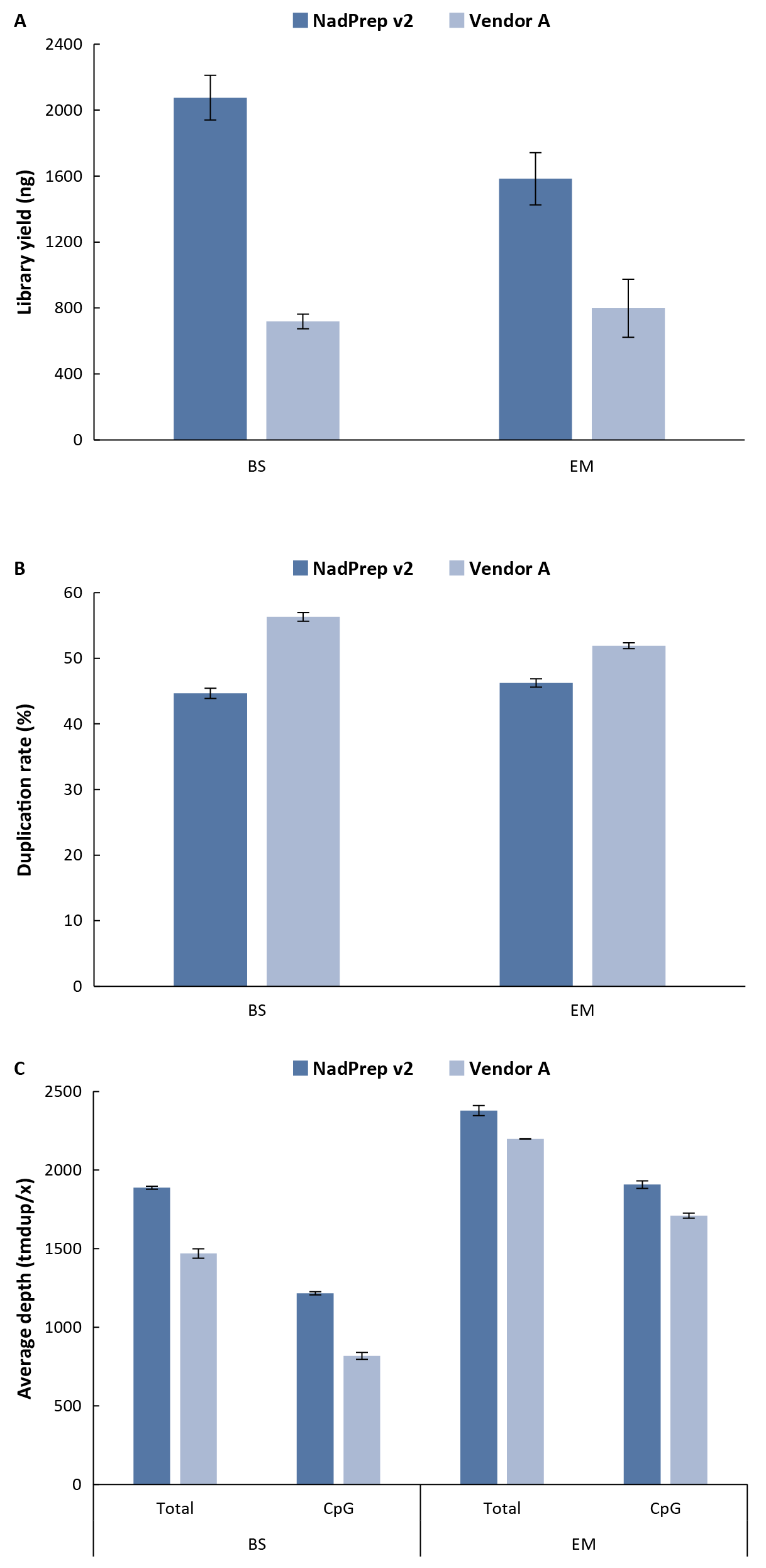 图 4. NadPrep® Methyl Stubby Adapter (UDI) Module v2 和 Vendor A 的建库性能比较。A. 文库产量;B. 重复率;C. 去重后平均覆盖深度。50 ng gDNA 样本利用 NadPrep® Methyl Library Preparation Module v2 分别搭配 NadPrep v2 及 Vendor A 接头模块经 BS 和 EM 转化后构建预文库,以 μCaler® Hybrid Capture Reagents v2 和 μCaler® EMS Panel v1.0 完成杂交捕获。