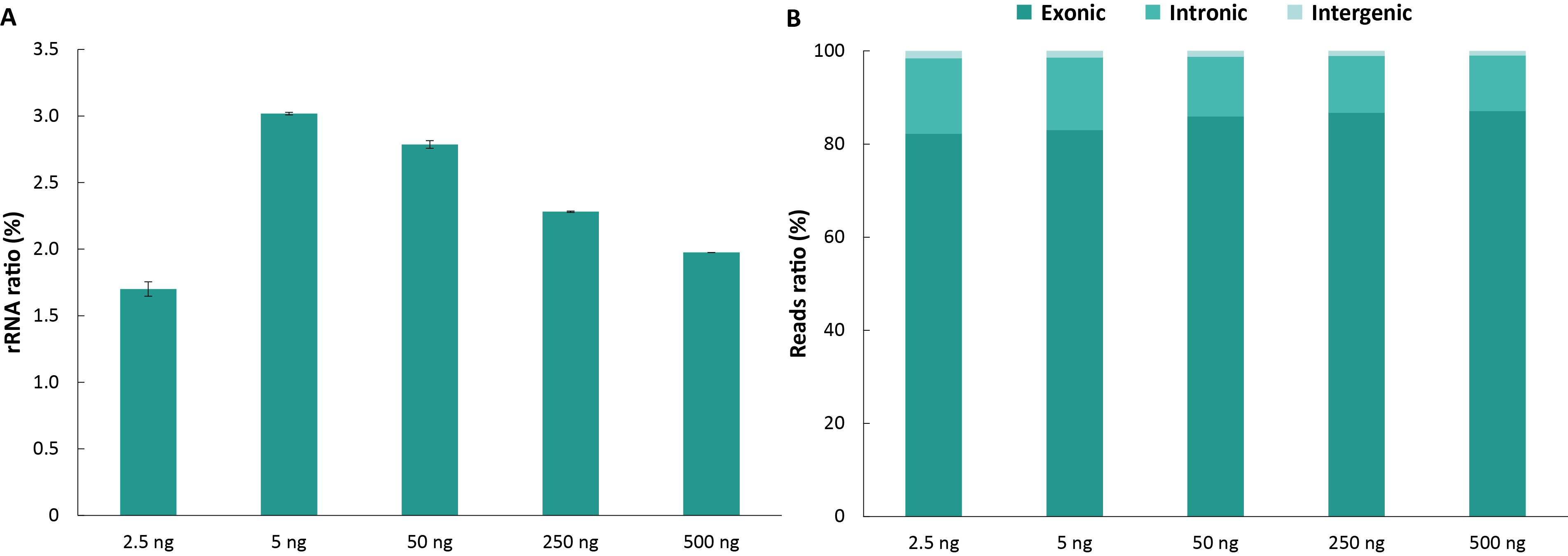图 1. RNACap 端到端方案有效提升测序数据利用率。A. rRNA 占比;B. Reads 分布占比。不同起始投入量细胞系 RNA 样本利用 NadPrep® EZ RNA Library Preparation Module 搭配 NadPrep® Universal Adapter (MDI) Module (for MGI) 构建预文库,500 ng/预文库投入杂交,以 NanOnco Plus Panel v2.0 和 NadPrep® Hybrid Capture Reagents 完成捕获。测序模式为 DNBSEQ-T7,PE150,每个样本随机选取 0.3 Gb 用于数据分析。