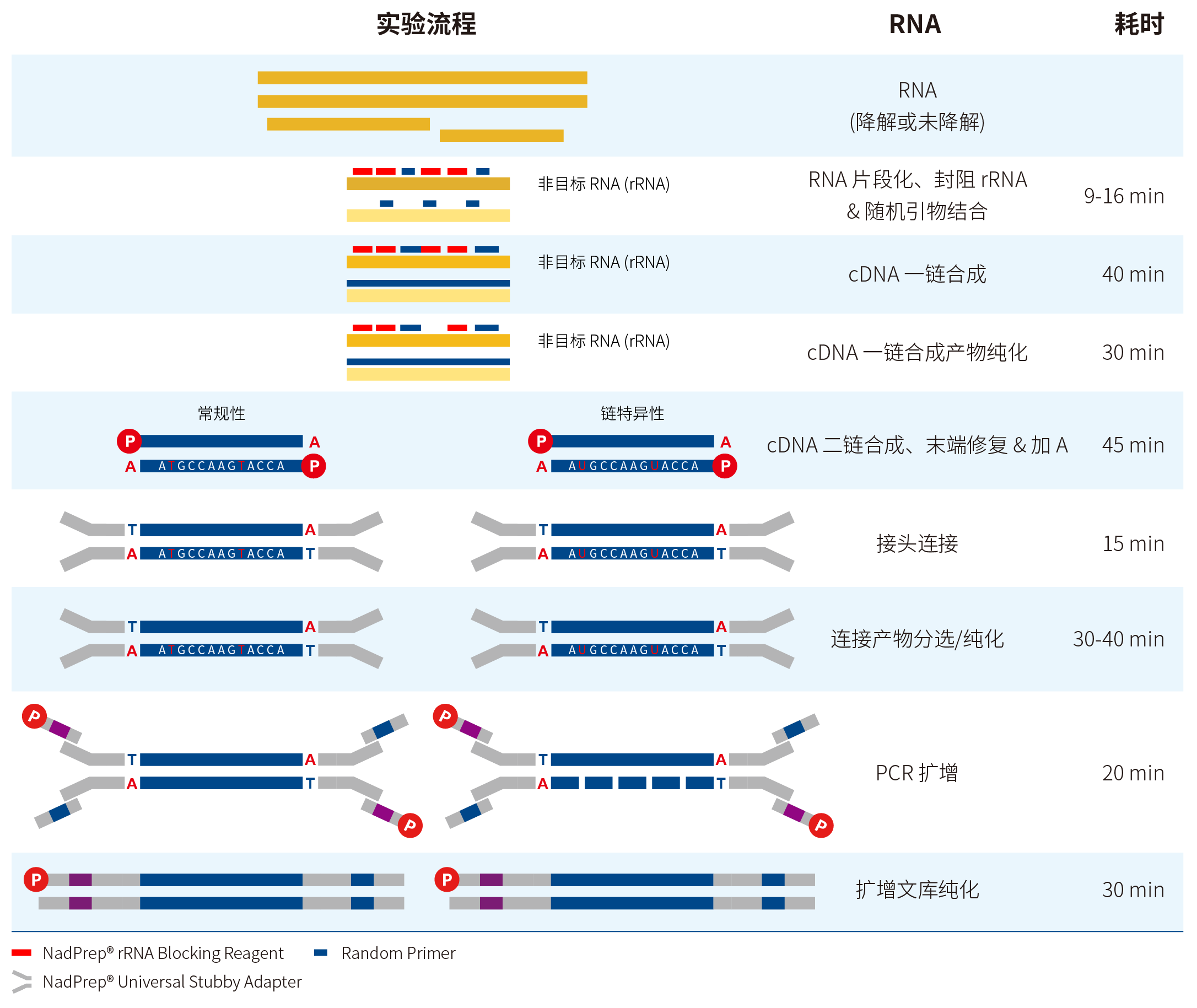 图 2. 利用 NadPrep® 快速 RNA 文库制备试剂盒衔接上游 rRNA 快速封阻 (全转录组测序方案) 构建常规性与链特异性文库的工作流程示意图。