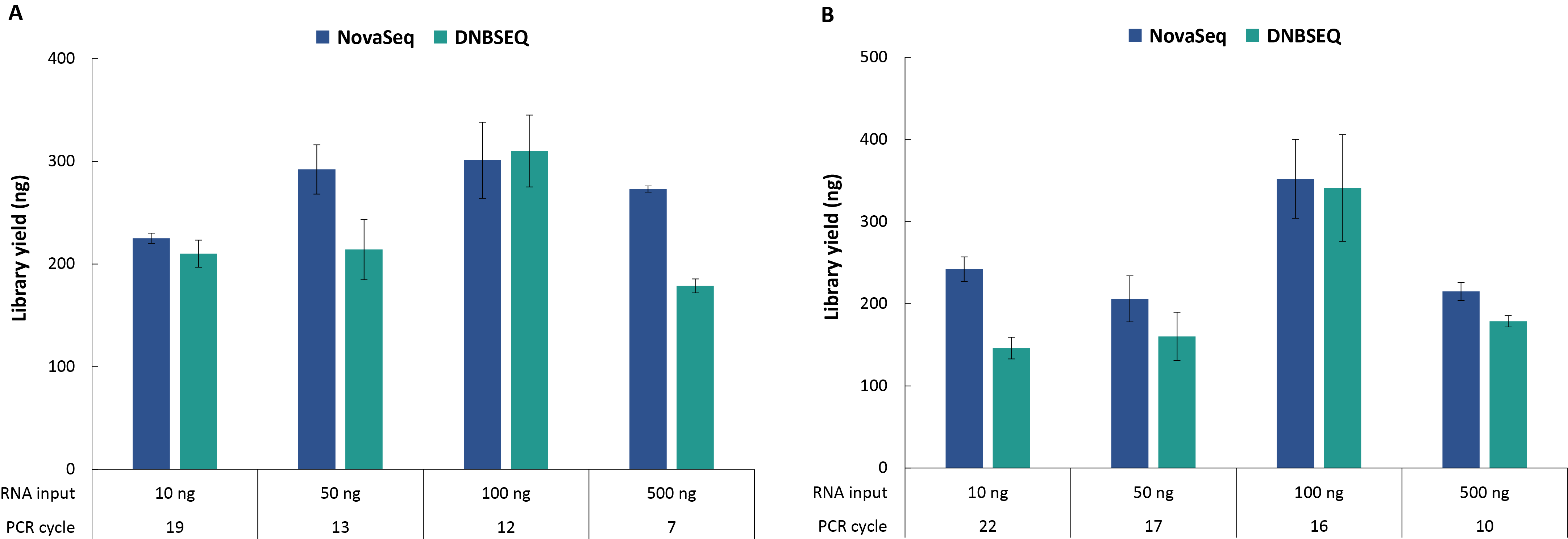 4. 全转录组测序方案对不同起始投入量细胞系 RNA 样本的建库产出。A. 常规性文库;B. 链特异性文库。