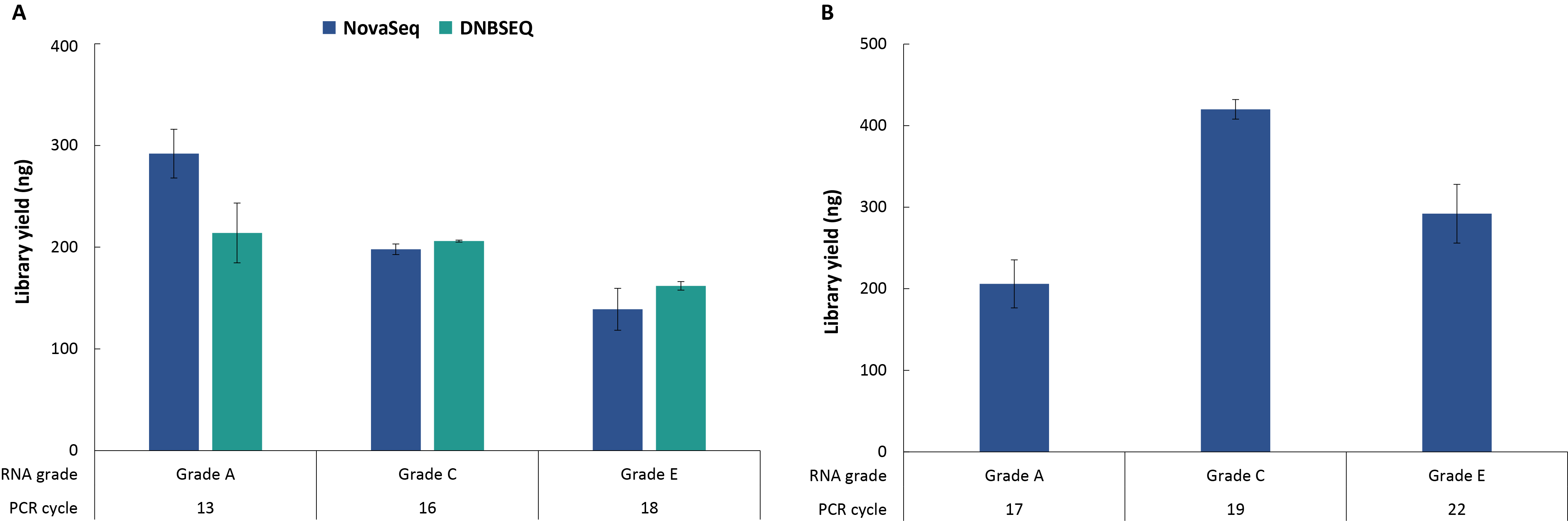 5. 全转录组测序方案对不同质量等级的 RNA 样本的建库产出。A. 常规性文库;B. 链特异性文库。