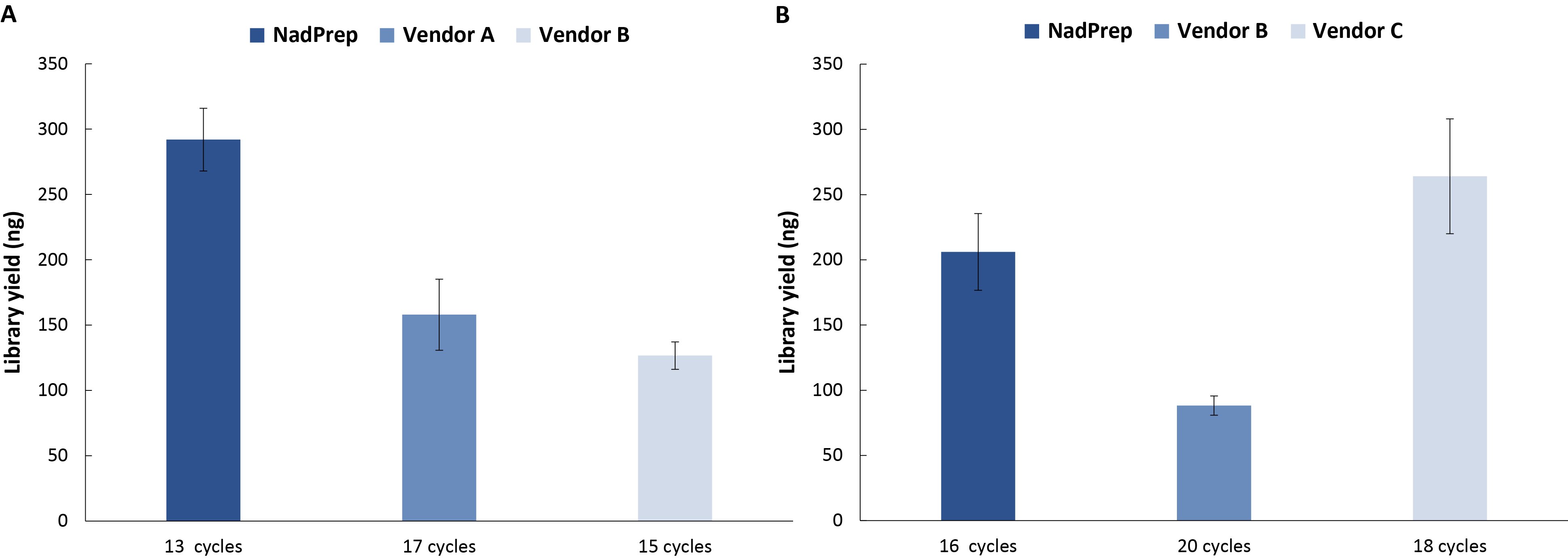 6. 结合 NadPrep® rRNA Blocking Reagent NadPrep® 快速 RNA 文库构建试剂盒较 Vendor A/C & B 具有更高效的文库产出。A. 常规性文库;B. 链特异性文库。