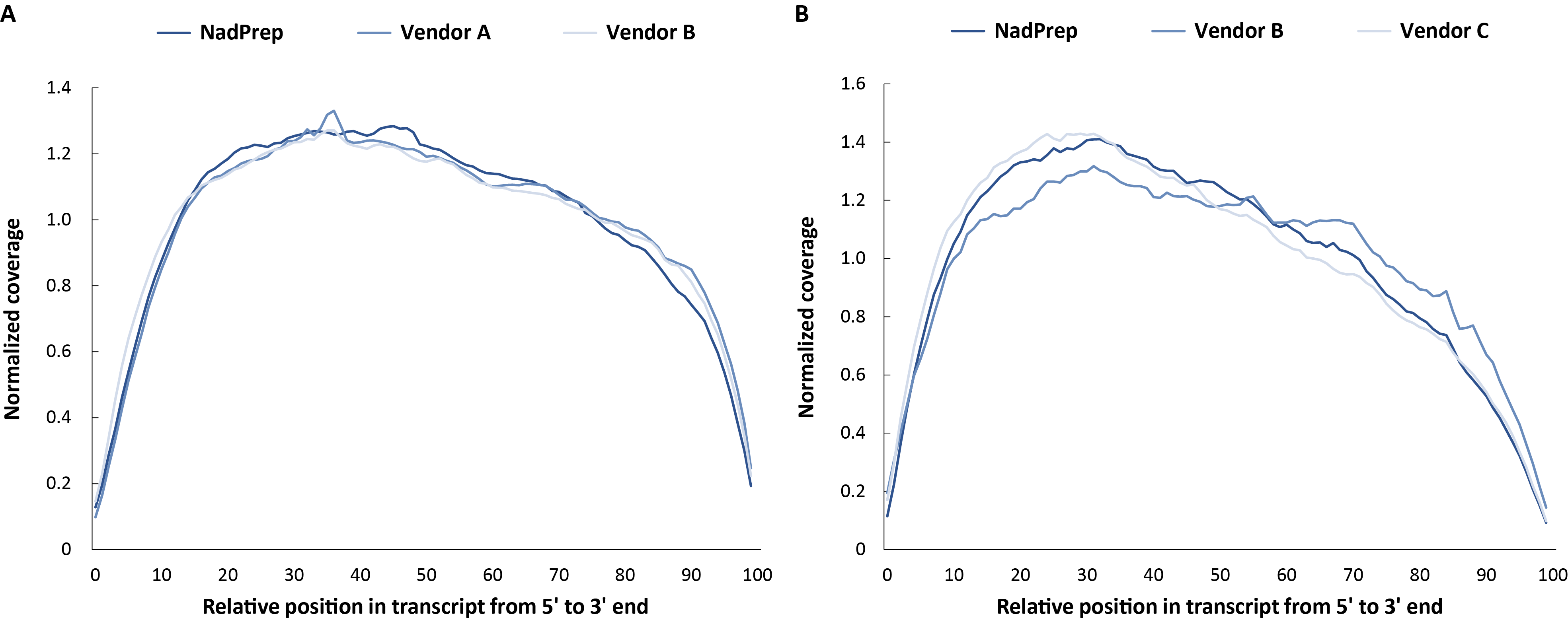 7. 结合 NadPrep® rRNA Blocking Reagent NadPrep® 快速 RNA 文库构建试剂盒较 Vendor A/C & B 具有更均匀的转录本覆盖。A. 常规性文库;B. 链特异性文库。测序模式为 NovaSeq 6000,PE150,每个样本随机选取 0.3 Gb 用于数据分析。