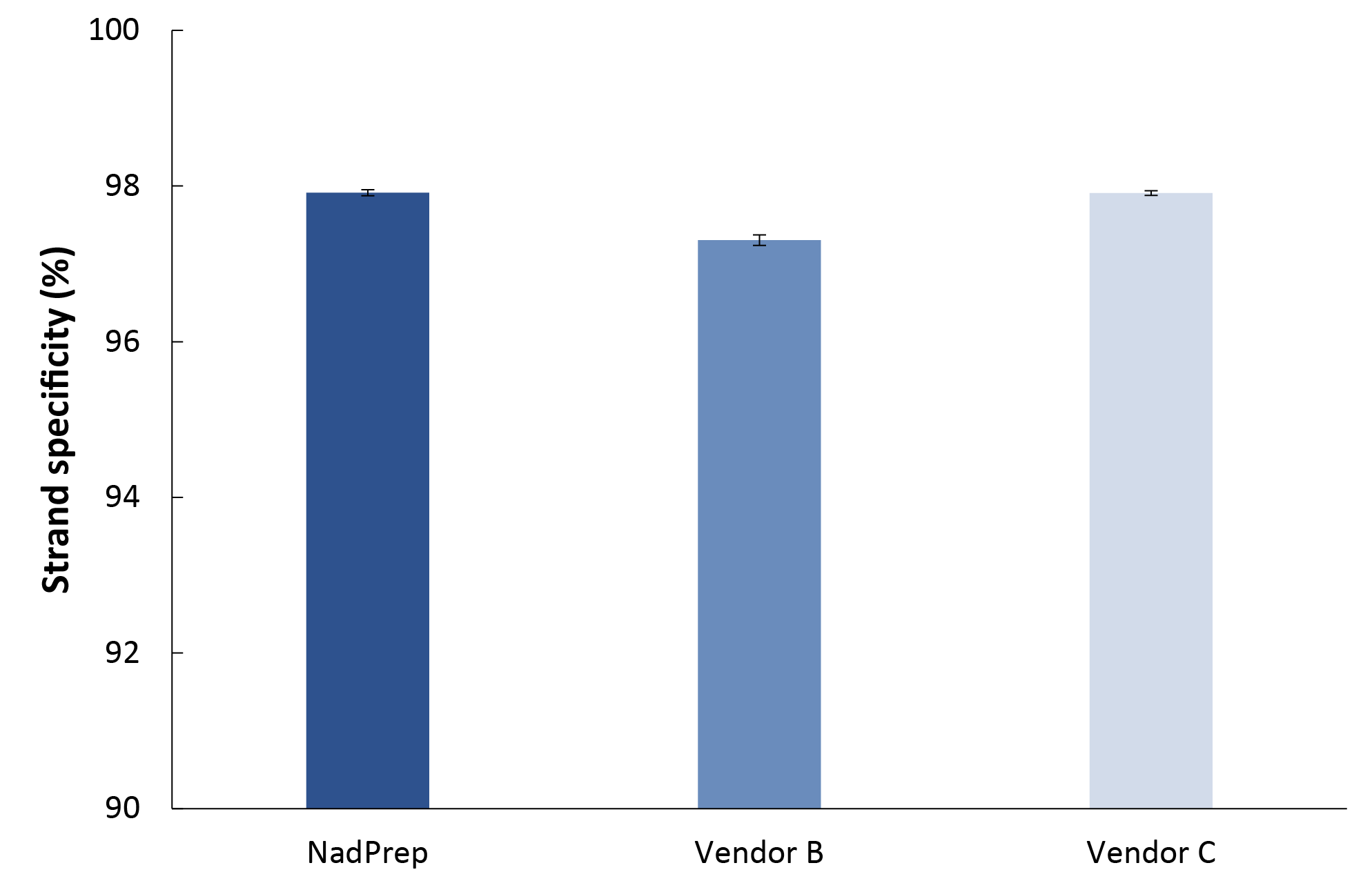 同样,在链特异性评估中,NadPrep 构建的文库中超过 97.9% 的 reads 都比对到了预期方向链上,显示出良好的链特异性;其表现与市场主流产品 (Vendor B & C) 基本相当 (图 8.)。
